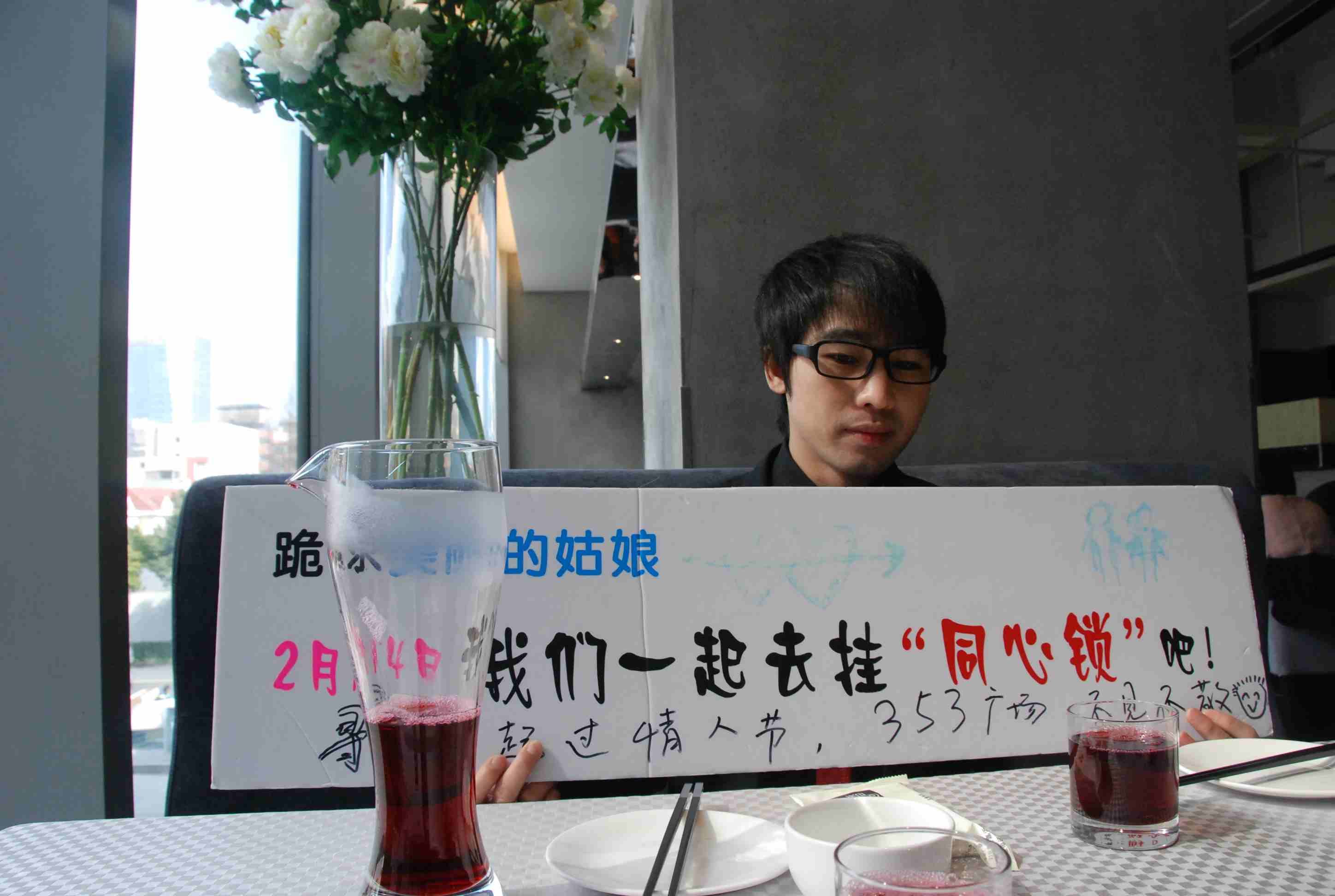 這個富二代的紅鎖男比我想像中配合,我女同學(xué)請他拿著牌子在餐廳的走廊里走一圈,他還真就走了一圈,不過當(dāng)時是下午3、4點鐘,餐廳人不多